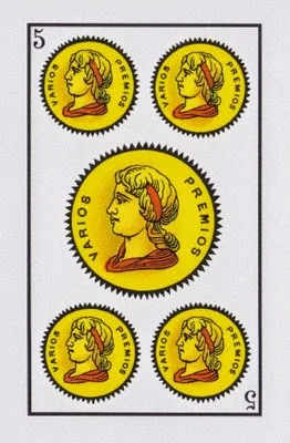 El Cinco de Oros habla de celebraciones, resoluciones, la búsqueda de respuestas ante los problemas, unión o asociación de personas para buscar un beneficio común.