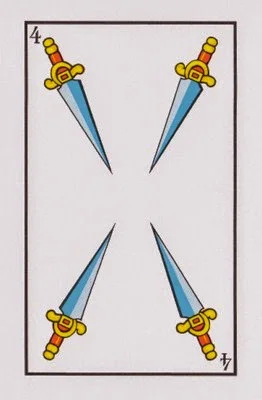 El Cuatro de Espadas suele ser comparada con la carta "La Muerte" del Tarot, hace referencia a un período de mentiras, de dificultades y de estafas. También habla de problemas de salud, enfermedades qué llevan al aislamiento y soledad. Se es forzado al exilio debido a una enfermedad, por terceras personas, drogas, depresión...