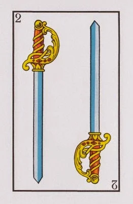 El Dos de Espadas habla de sorpresas inesperadas, habría qué fijarse en las cartas de alrededor en la tirada para saber exactamente a qué sorpresa se refiere. La sorpresa en si puede ser tanto buena cómo mala y no tiene ser precisamente inesperada en todos los casos.