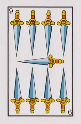 El Nueve de Espadas habla de sufrimientos causados por la envidia, engaños en el entorno. Es una carta bastante negativa ya qué suele indicar conflictos, desesperación y miedo. Existe mucha inseguridad bastante justificada debido a qué existe peligros inminentes, problemas de salud por adicción o enfermedad.