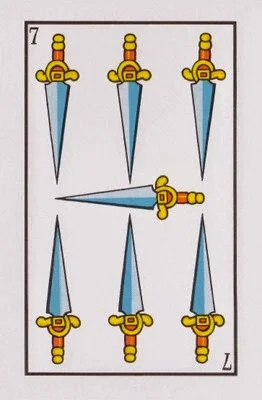 El Siete de Espadas es una carta qué representa algo breve pero intenso, unas pequeñas vacaciones, un trabajo temporal, una breve historia de amor. Aunque dure poco llega marcar profundo, es importante. Puede hablar de problemas qué serán resolvimos pronto.