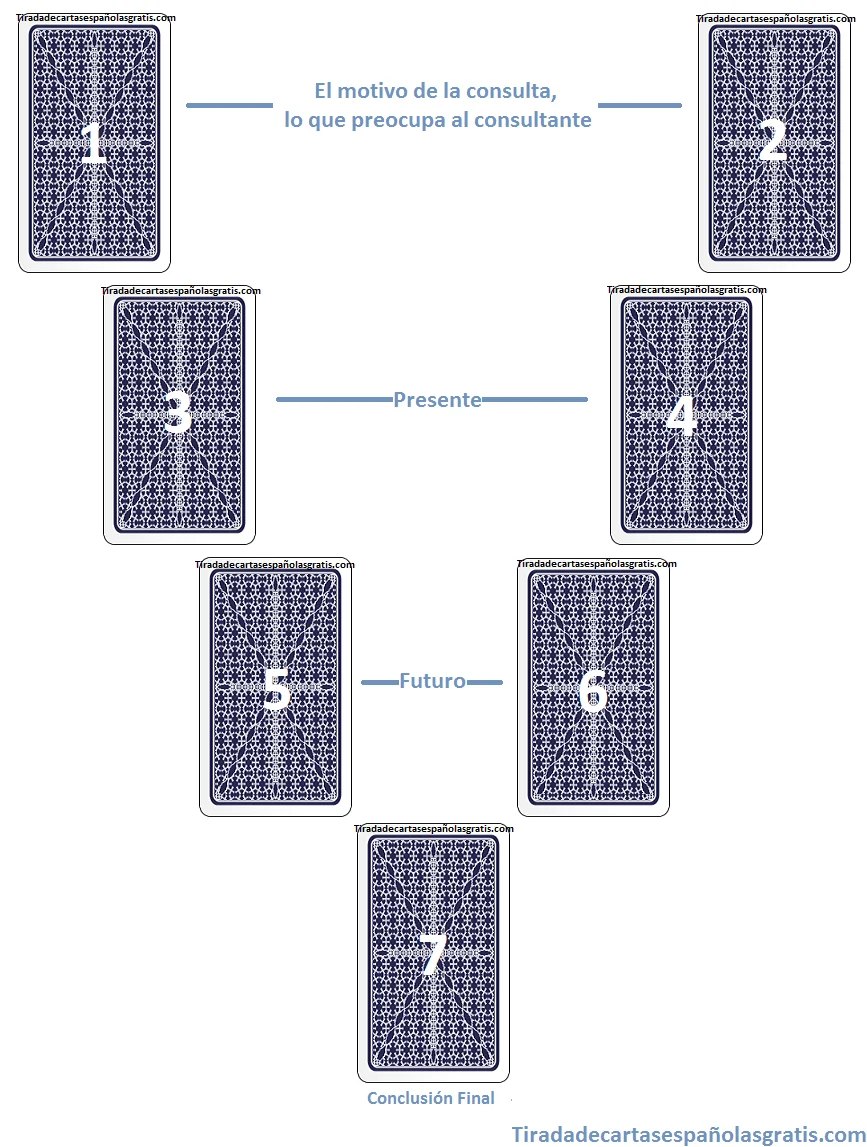 - La séptima carta es la conclusión final, confirma la información qué las anteriores cartas nos ha proporcionado. Mucha atención a dicha carta ya qué nos dice más o menos cómo solucionar esa situación.